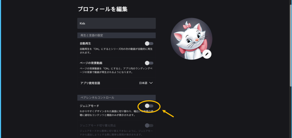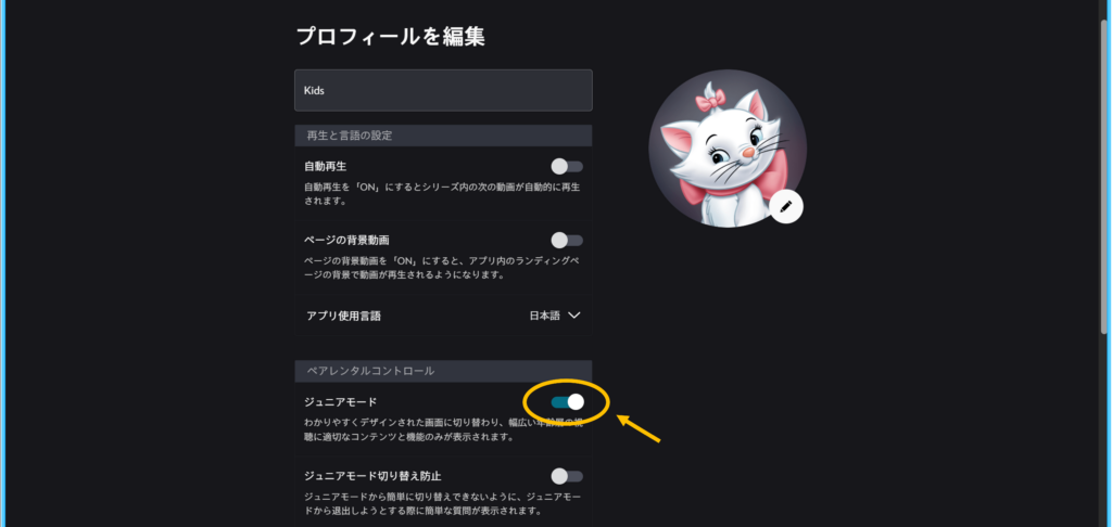 ジュニアモードは、子ども用プロフィールを作成し、プロフィール編集画面から設定できます。