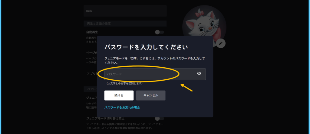 ③「ジュニアモード」をOFFにすると、パスワードの入力を求められます。